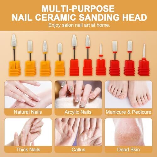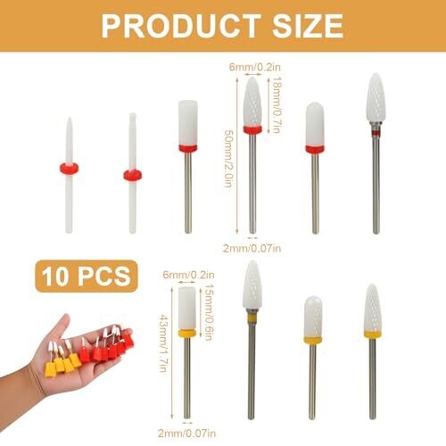 A versatile 10-piece ceramic and acrylic nail drill bit set for at-home or salon use. Includes cuticle bits and electric nail file accessories suitable for acrylic manicure and pedicure, promoting efficient filing, shaping, and smoothing.