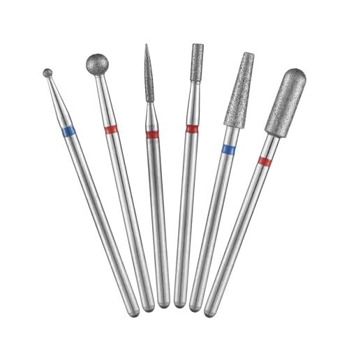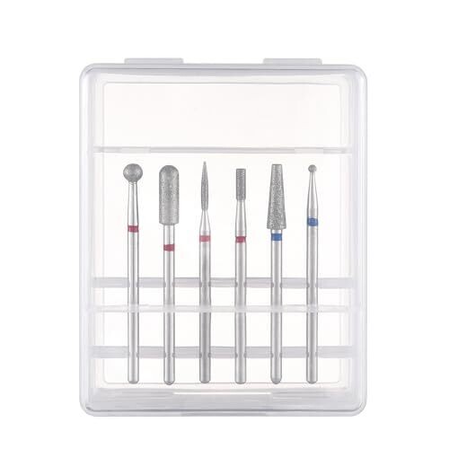 Includes 6 diamond nail drill bits with a storage box. Capable of polishing gel and removing cuticles. Six different bit shapes cover needs for nail surface and nail edge detailing. The set is designed for home use with a compact case for portability.