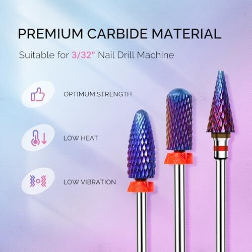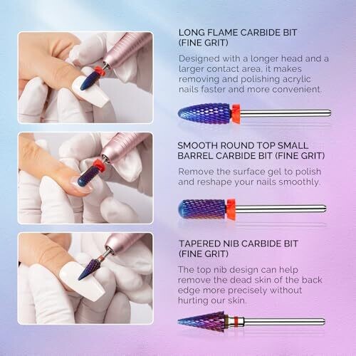 Professional-grade MelodySusie 3Pcs nail drill bits set delivers precise, fast acrylic and gel removal with durable carbide tungsten bits. Long flame for quick material removal; smooth barrel nib for safe shaping; tapered nib for hard-to-reach areas. Purple finish.