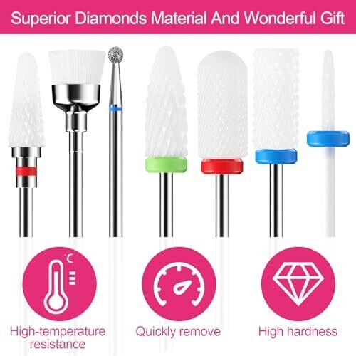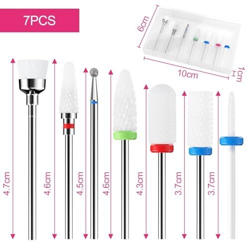 seven ceramic drill bits with varying grit levels (including fine, medium, coarse and extra coarse) to accommodate different nail art tasks.
