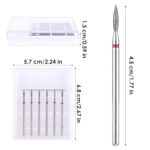 Professional 6-piece cuticle drill bit set designed for precise cuticle removal and nail bed cleaning. Diamond-coated bits provide durable performance on natural and artificial nails. Includes a transparent storage case; compact 1.77 inches; 3/32