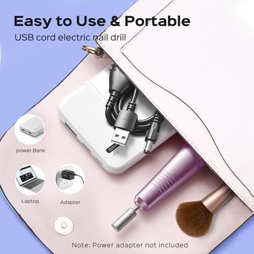The electric nail drill kit includes a powerful professional motor capable of achieving increased polishing efficiency. It is suitable for use at home or in a nail salon and can be used for buffing, grinding, shaping, and removal on natural nails, acrylic nails, artificial extensions, poly gel, dip powder, thick nails, and cuticle dead skin. The device features low heat, low noise, and low vibration with a durable motor (lifespan up to 3 years) to reduce fatigue during extended use. It has an ergonomic design and a stepless adjustable speed knob to control speed and direction. The kit is portable and compact, designed for convenient transport and storage. It includes 6 metal drill bits and multiple polishing strips. The unit must be connected to a power source and comes with a 6.5 ft control cable; an adapter is not included but can be charged with any 5V adapter. Packaging may vary, but contents remain the same.
