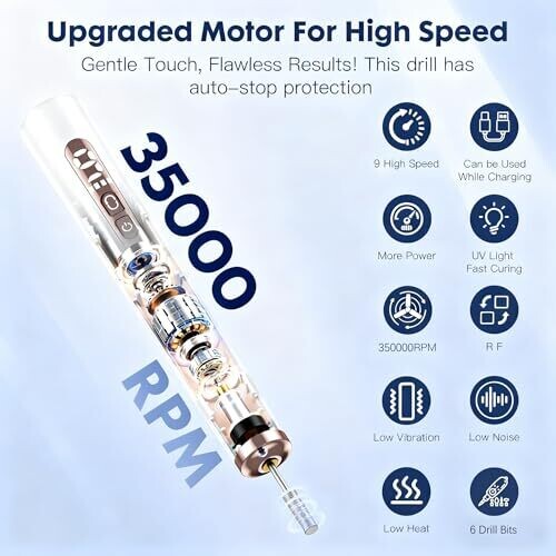 - Powerful 9-speed control (5,000–35,000 RPM) delivers precise filing, shaping, and finishing for natural and artificial nails.