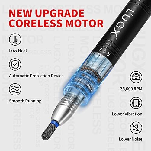 - Powerful coreless motor enables up to 35,000 RPM for fast, clean shaping and refining of nails.