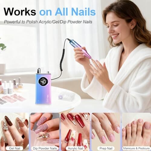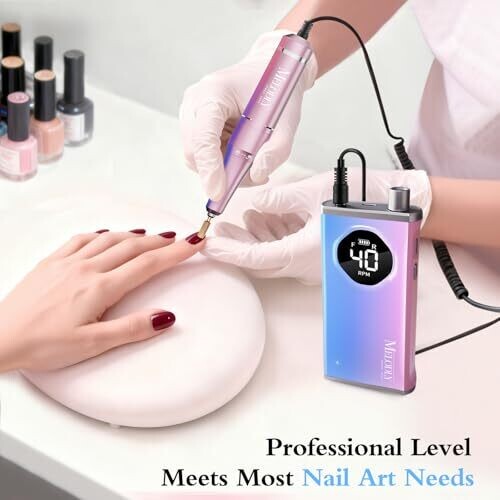 Elevate nail care with this cordless Electric Nail Drill File. It delivers up to 40,000 RPM for fast shaping, trimming, and polishing with minimal heat. Rechargeable battery, LCD display, belt clip, twist-lock bits, and versatile gold and ceramic bits for salon or home use.