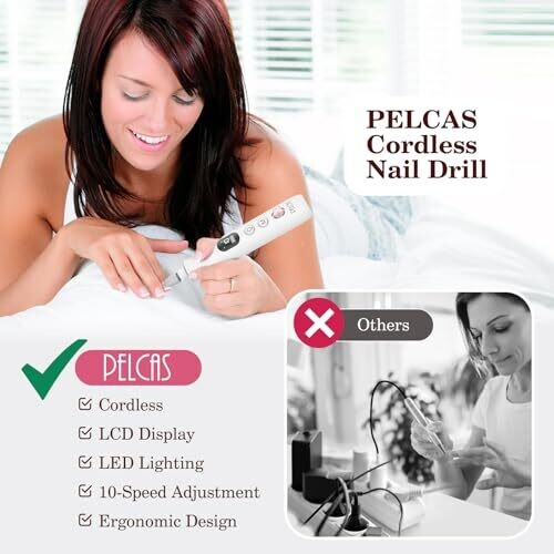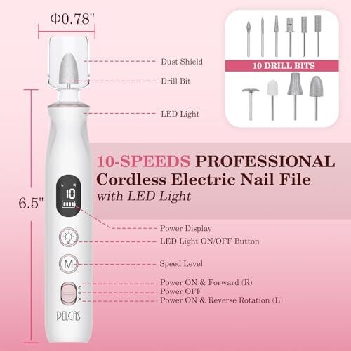 • Pelcas Electric Nail File, 10 Speeds Cordless Nail Drill with LED, Manicure Kit