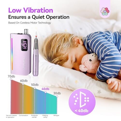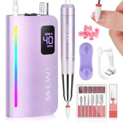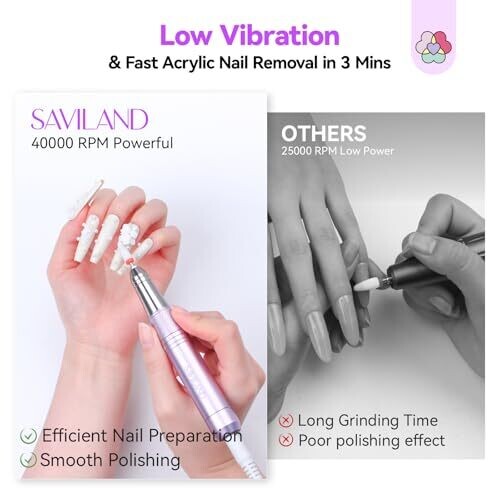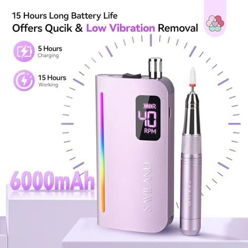• Saviland Nail Drill Pro: 40000 RPM Nail File Low Vibration Light 15H Battery