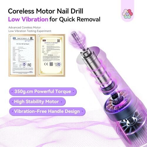 Coreless motor with approximately 350 gf·cm torque for salon-grade shaping, filing, and polishing. Intelligent heat control maintains <42°C during extended use for safety. Maximum speed of 40000 RPM enables fast gel/acrylic removal with reduced vibration compared to brushed motors.