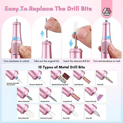• Includes a versatile set of 13 drill bits to grind, carve, cut, polish, and remove gel polish, cuticles, and dead skin safely.