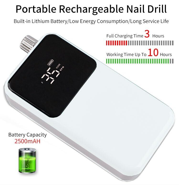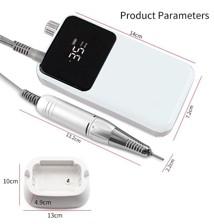 Premium brushless motor delivers smooth nail drilling at home or in the salon. Portable wireless 2-in-1 design with belt clip, adjustable speeds, ergonomic lightweight handle, low vibration, and a bright white finish for any workspace. Safe for professionals and beginners alike.