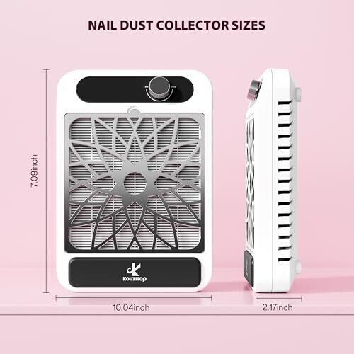 10.04 x 7.09 x 2.17 inches. Lightweight and portable for salon or home use. Large rear ventilation holes for continuous airflow and cooling. Suitable for use with acrylic filing, gel polish, and nail art; designed for extended use in busy nail salons.