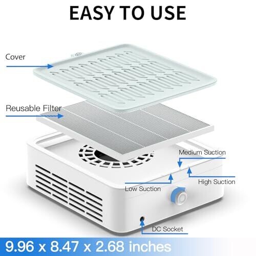 - Powerful 120W motor with high-speed suction that captures nail dust and fly ash during filing and polishing.