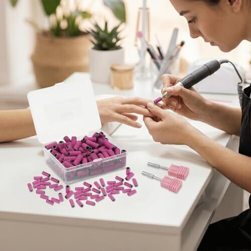 High-quality mini sanding bands designed for precise manicures and pedicures. Includes 100 #240 grit bands and 2 stainless steel mandrel bits for secure attachment. Compact case keeps everything organized, portable, and ready for detailed shaping and edge work.