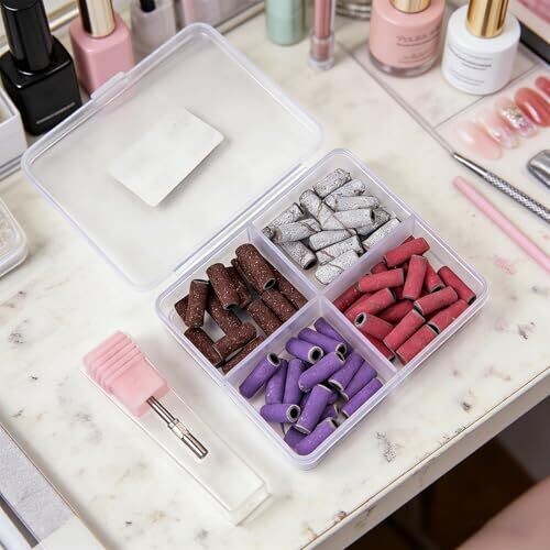 All-in-one nail drill set with 60 sanding bands and a 3mm mandrel for professional results. Full grit range (80, 120, 180, 240) for versatile filing, shaping, and finishing. Durable stainless steel mandrel and a portable carrying case for travel and hygiene.