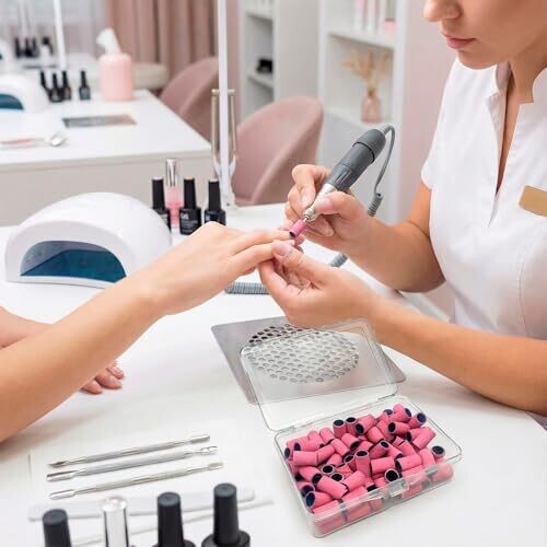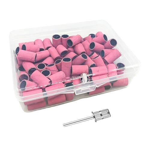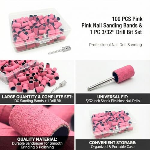 Includes 100pcs of 180 grit sanding bands for nail drills, pink color, plus two 3/32 inch nail drill bits and a box for storage. Ideal for beauty salons, manicures, and pedicures.