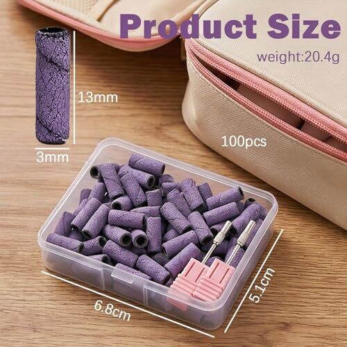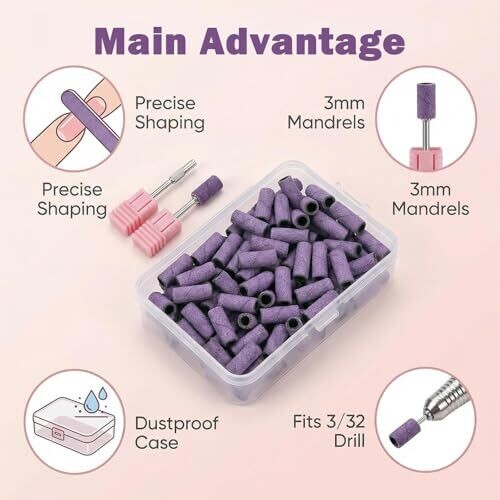 Kit contains 100 pieces of #180 grit mini sanding bands and 2 stainless steel mandrel bits, each 3 mm in diameter. The 3 mm mandrel bits are compatible with most 3/32" nail drills. The storage case is clear and designed to be dustproof and waterproof to protect the contents. The kit is intended for professional manicures and pedicures, including removal of gel applications and shaping of nails.