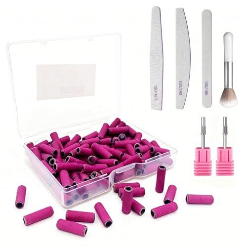 - All-in-one nail drill set designed for home use, combining sanding bands, mandrels, a dust brush, and nail files for a complete manicure and nail removal experience.