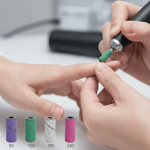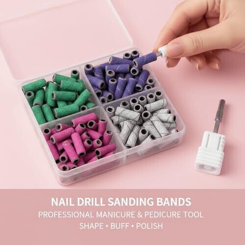 Professional-grade small sanding bands for precise shaping, smoothing, and polishing natural nails and acrylics. Includes 4 grit options (#80, #120, #180, #240) with a 3 mm mandrel, in a portable, dustproof case for home or salon use.