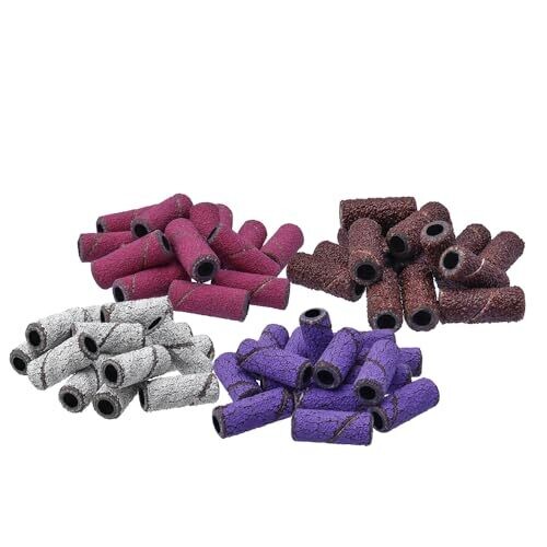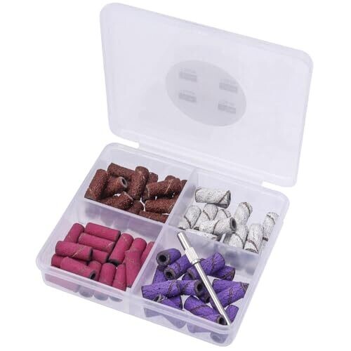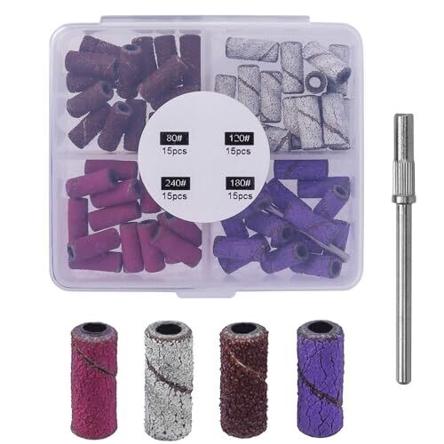 Yakamoz 60Pcs Sanding Bands set includes four color-coded grits (#80, #120, #180, #240) with a 3mm mandrel. Durable abrasive belts shape acrylics and natural nails quickly. Compact case keeps pieces organized for on-the-go manicures and pedicures.