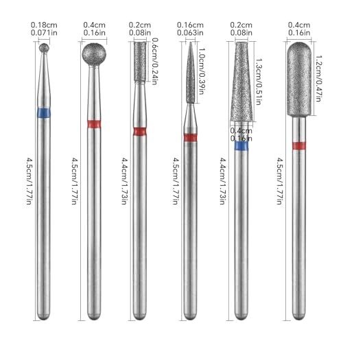 Includes 6 diamond nail drill bits with a storage box. Capable of polishing gel and removing cuticles. Six different bit shapes cover needs for nail surface and nail edge detailing. The set is designed for home use with a compact case for portability.