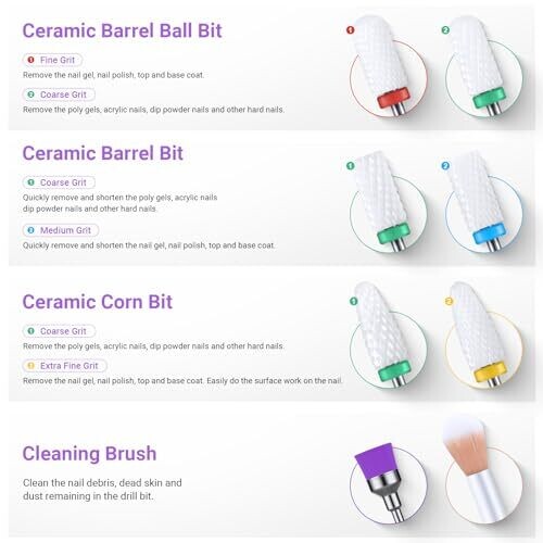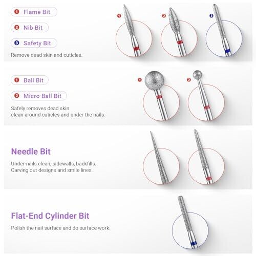 - Includes a versatile assortment of bits crafted for precise shaping, filing, and finishing of acrylic, gel, and dip nails.