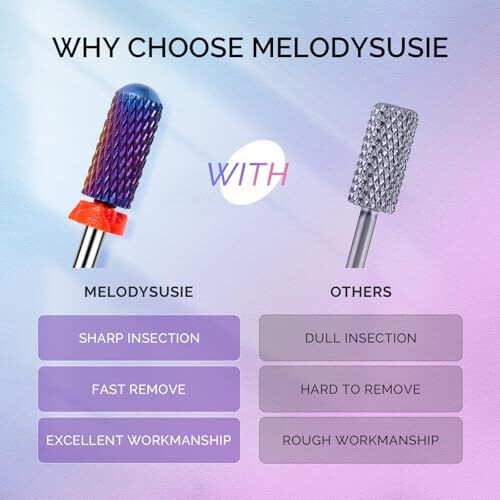 Professional-grade MelodySusie 3Pcs nail drill bits set delivers precise, fast acrylic and gel removal with durable carbide tungsten bits. Long flame for quick material removal; smooth barrel nib for safe shaping; tapered nib for hard-to-reach areas. Purple finish.