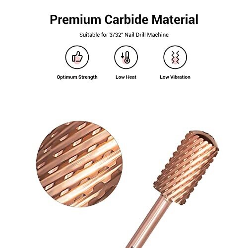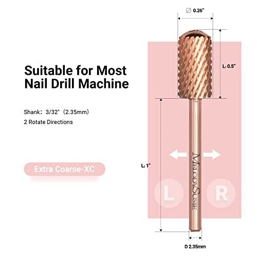 Rose gold MelodySusie safety nail drill bits feature a large barrel and smooth round top for comfortable, controlled manicures and pedicures. Extra coarse carbide with cross-cut design removes gel and nails quickly, fits most drills (3/32'' shank), two-way rotation, beginner-friendly.