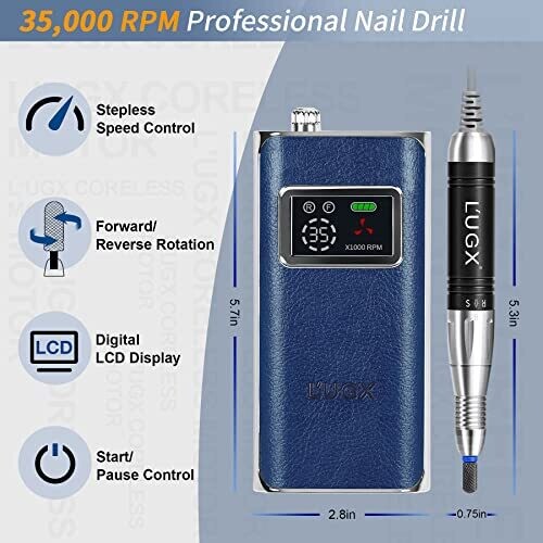 L'ugx Professional Nail Drill, 35000rpm Rechargeable Efile for Acrylic & Gel Nails (Klein Blue)