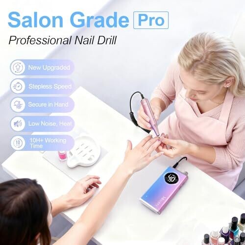 Elevate nail care with this cordless Electric Nail Drill File. It delivers up to 40,000 RPM for fast shaping, trimming, and polishing with minimal heat. Rechargeable battery, LCD display, belt clip, twist-lock bits, and versatile gold and ceramic bits for salon or home use.