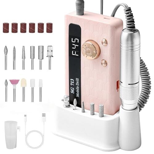Experience salon-quality nails with a whisper-quiet, high-performance electric nail drill. Compact, cordless, and pink, it includes an 11-piece bit set, an LED display, and a detachable base that also charges. Ergonomic grip and easy bit changes for comfort.
