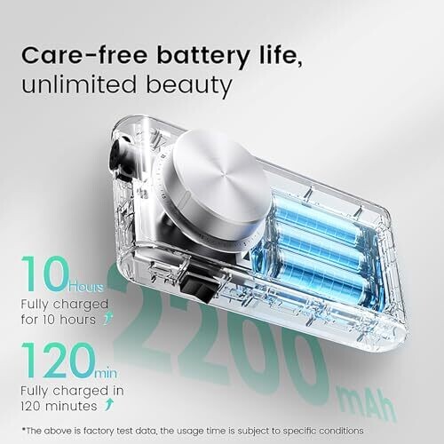 2200 mAh capacity, up to 12 hours of use after a 2-hour charge.
