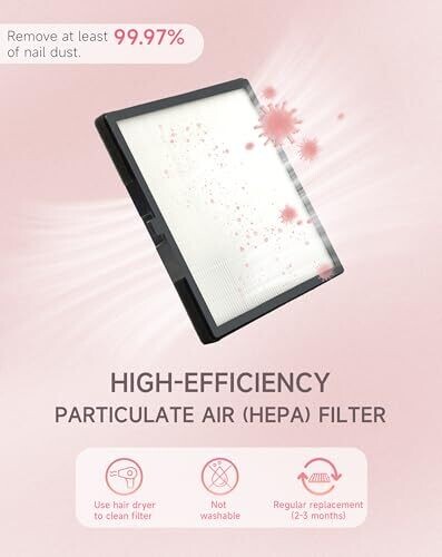 Powerful 60W nail dust collector with a brush and 2 reusable filters keeps your workspace clean for precise acrylic nail work. High suction captures dust at the source, with a compact pink design and easy one-button operation.