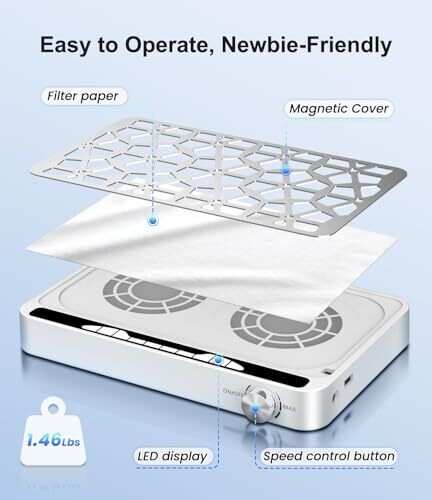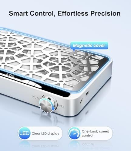 Experience salon-grade cleanliness with 1600PA suction that captures nail dust and debris quickly. With 10 adjustable speeds and an LED display, you can tailor each service. Magnetic base enables tool-free cleanup, and 30 disposable filters protect health and hygiene.