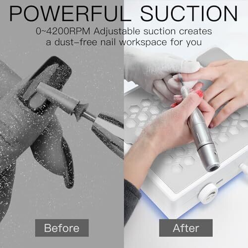 - High-power suction capable of pulling dust up to 3.5 inches above the nail at maximum speed, with gentle performance at lower speeds.