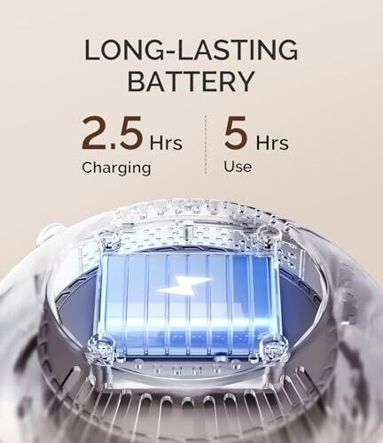 Rechargeable lithium‑ion battery with a 2.5-hour full charge and up to 5 hours of use.