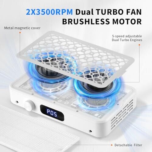 Experience salon-grade power with 1600PA dual-turbo suction and twin 3500 RPM motors for fast, clean nail dust removal. Features a 5-speed smart dial, LED display, 10 filter papers, reusable filter pad, and a slim, portable design for mobile or home use.
