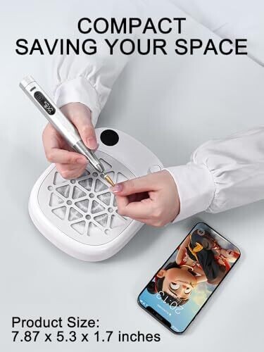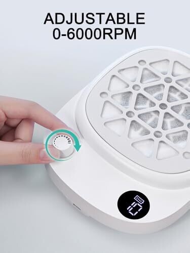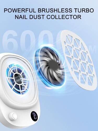 Cordless, rechargeable nail dust collector that sits neatly on your manicure table. It delivers strong 6000 RPM suction for dust and fly ash during filing, with a reusable fine filter. Low-noise, portable, and includes 30 filter papers for easy maintenance.