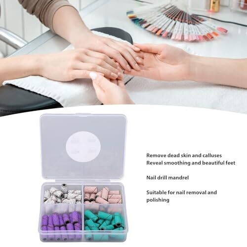 60 pieces of small sanding bands for nail drills, designed for professional use in manicures and pedicures. Includes a nail drill mandrel for easy attachment of sanding bands. Intended for removal of dead skin and calluses and for smoothing feet. Made from durable sanding material to provide long-lasting performance. Set is suitable for home foot care as well as professional use.