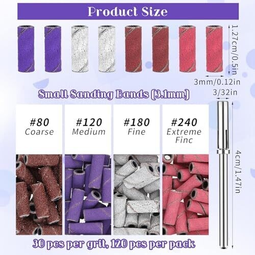 120-piece sanding bands set with a 3mm mandrel bit, featuring brown #80, purple #120, white #180, and pink #240 grits. Fits most electric nail drills, ideal for precise shaping in acrylic and gel manicures, plus pedicures. Durable, wear-resistant with a compact storage box.