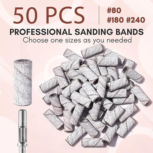 This marketing-focused set delivers faster, smoother nail prep with upgraded sanding bands. Includes 50 pieces for precise control on a 3.1mm mandrel, 180 grit for efficient yet gentle material removal. Compact, durable, ideal for pros, salons, or home use.