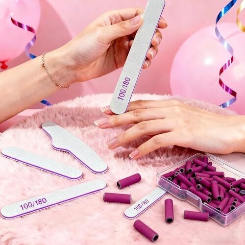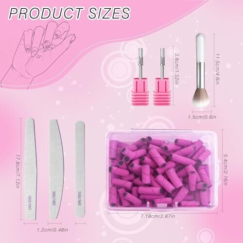 - All-in-one nail drill set designed for home use, combining sanding bands, mandrels, a dust brush, and nail files for a complete manicure and nail removal experience.